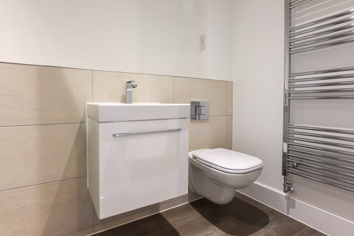 - Duravit white bathroom sanitary ware with stylish Hansgrohe taps, concealed cisterns, wall hung WC's and chrome towel rail