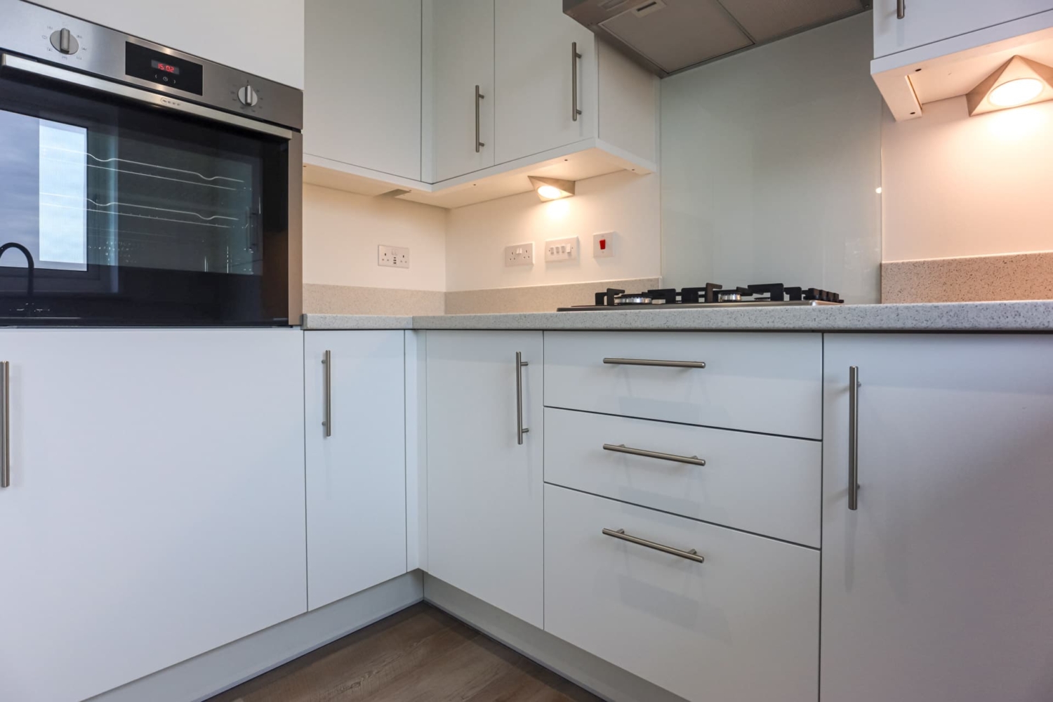 - Fully fitted kitchen, Neff oven / gas hob with stainless steel/glass splashback and hood extractor, integrated Neff fridge/freezer & dishwasher, space & plumbing for washer