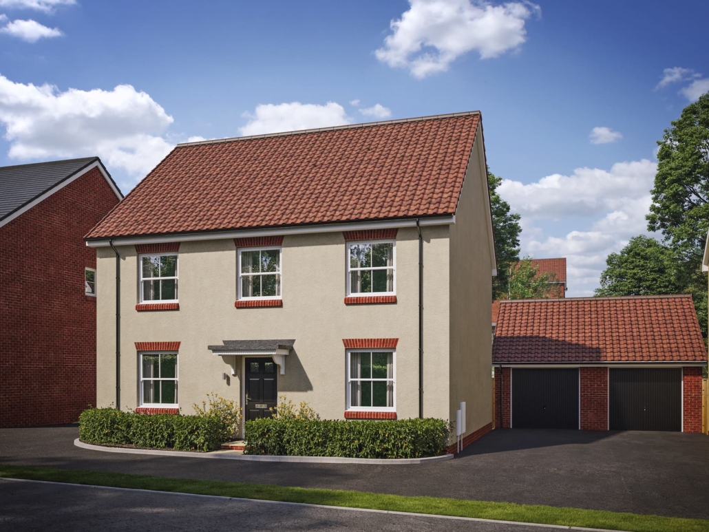 An impressive detached four bedroom home benefiting from high specification and generous accommodation over two floors. On the ground floor the entrance hall leads to the living room, study, cloakroom, kitchen/dining room and under stairs storage. The living room has double doors through to the impressive kitchen/dining room which has bi-fold doors opening to the enclosed rear garden, as well as access to the utility room and side door. On the first floor there’s an en-suite to the master bedroom, three further bedrooms, a family bathroom and an airing cupboard. A double garage and driveway parking are provided. Interior space is 1,493 sq ft. NOTE: Plot 16 is featured in the above CGI.